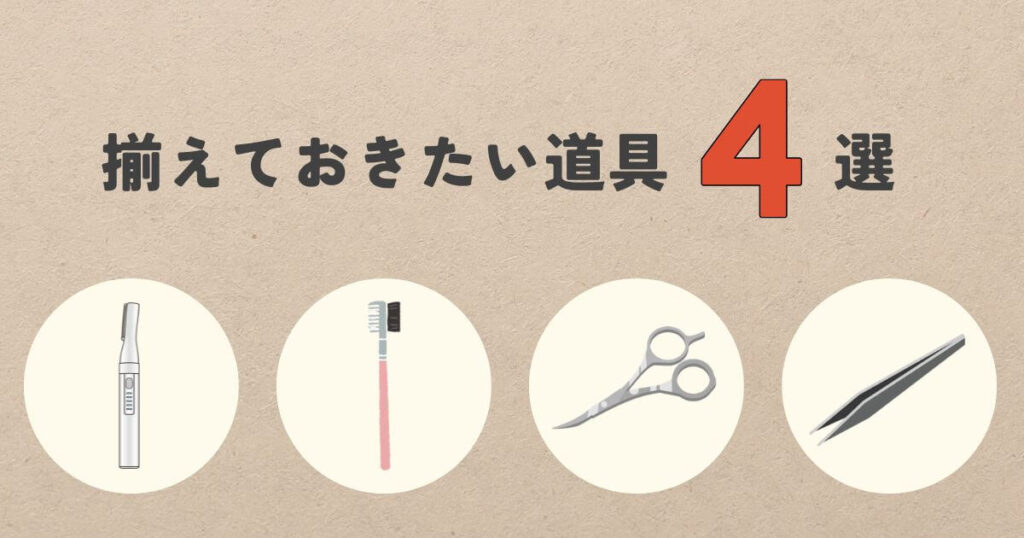 眉毛のセルフケアに必要な道具は、最低限4つあればOKです。ドラッグストアや楽天、100均などで揃えられます。