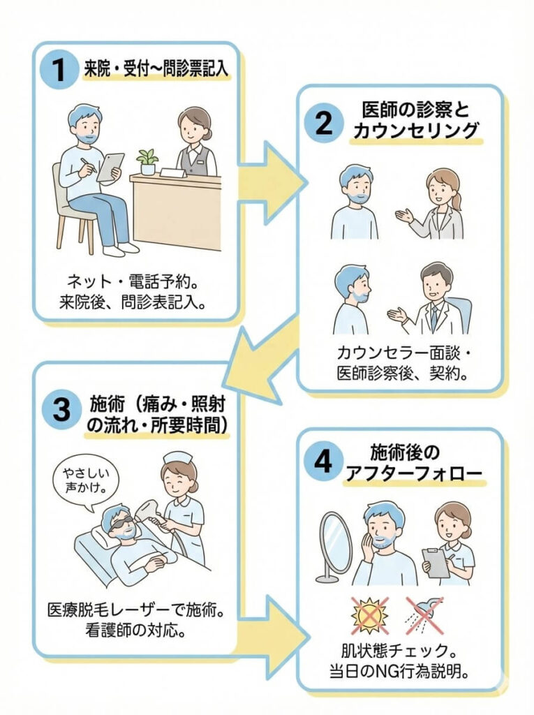 デリケートゾーン(VIO)は男性看護師が担当します。ヒゲ・身体については、当日の体制によって担当者が決まります。
